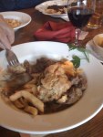 The food, for starter’s Fish Soup with Aioli & Gruyere, very meaty fish soup ! can you say that? I mean lot’s of nice fishy or seafoodie bits in this case, squid, mussels all sorts, lovely consistency and a nice floating crouton with a dollop of Aioli and sprinkling of Gruyere on top, yum. served with sundried tomato bread.