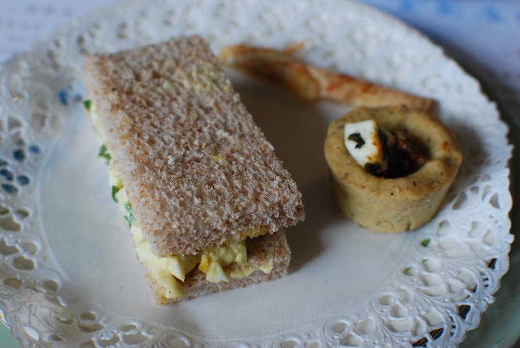 Delicate Sandwiches (crusties off!) included Homemade Potted Ham with Rocket, Free Range Egg (own freshly laid) Mayonnaise & Cress and Cheese and Homemade Pickle, these were accompanied by Olive & Feta Tartlets and Parmesan & Anchovy Straws, yum….
