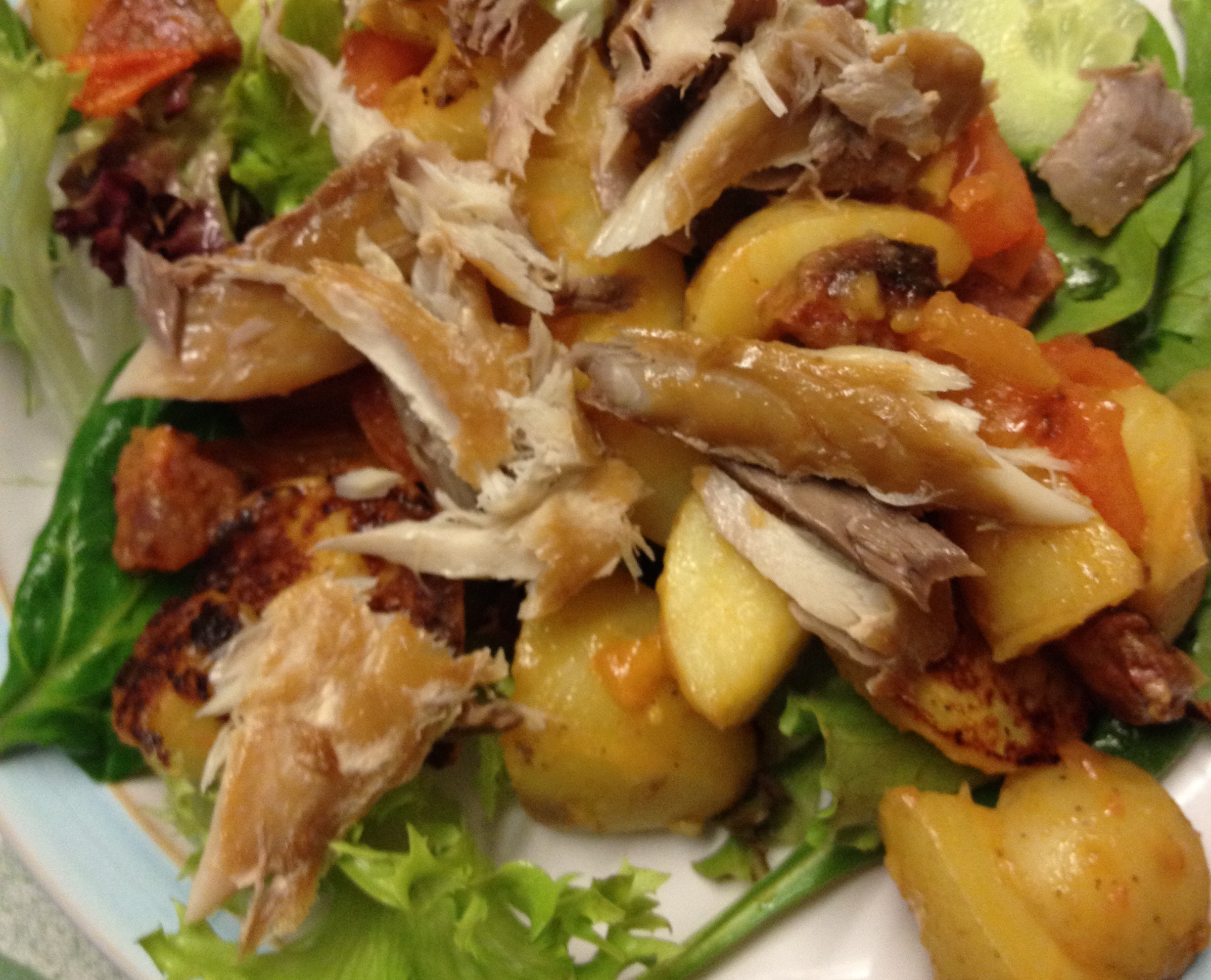 - Add the tomatoes and Chorizo to the pan and then flake the mackerel fillets in and gently mix, stir in the parsley and serve with a mixed leaf salad.