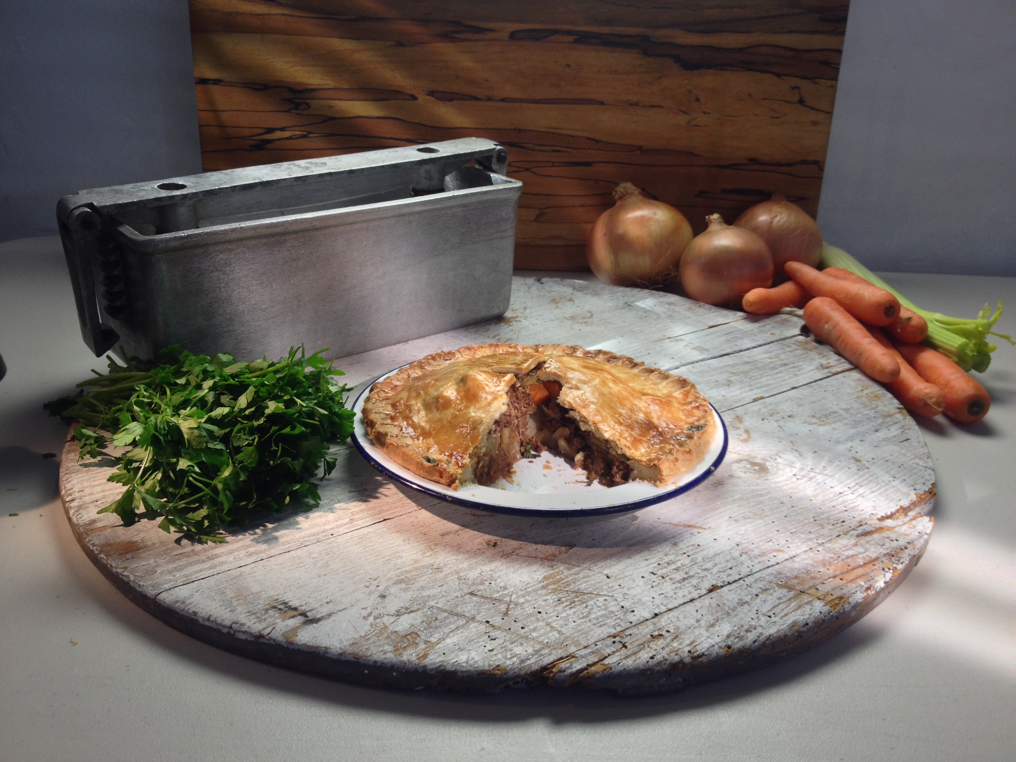 Paul Hollywood and his film crew from Spungold visited the farm and helped make Traditional Corned Beef, we visited the farm butchery, Town End Farm Shop and tearoom in Airton and finally I was invited down to London to the kitchen studio to film and taste the Pies and Puds to feature in our episode. An eclectic bunch of farmers, producers and craftsmen gathered and some interesting dishes prepared. Our episode will feature Cob Nuts from Kent, Apple Strudel prepared by Falko from Edinburgh and our own Corned Beef Plate Pie. Here is the finished pie photographed in the studio complete with corned beef press.