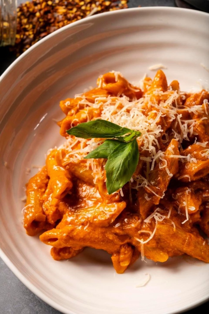 Step 3: Add the garlic, salt and chilli flakes to your shallots and gently fry for 30 seconds, then stir through the tomato purรฉe and butter until incorporated and add the vodka, simmer for 3 mins.